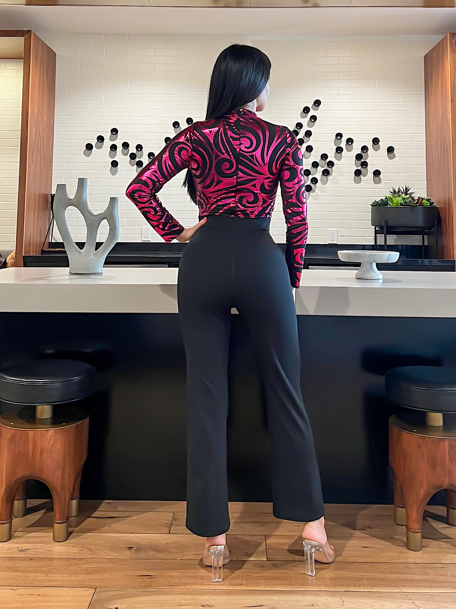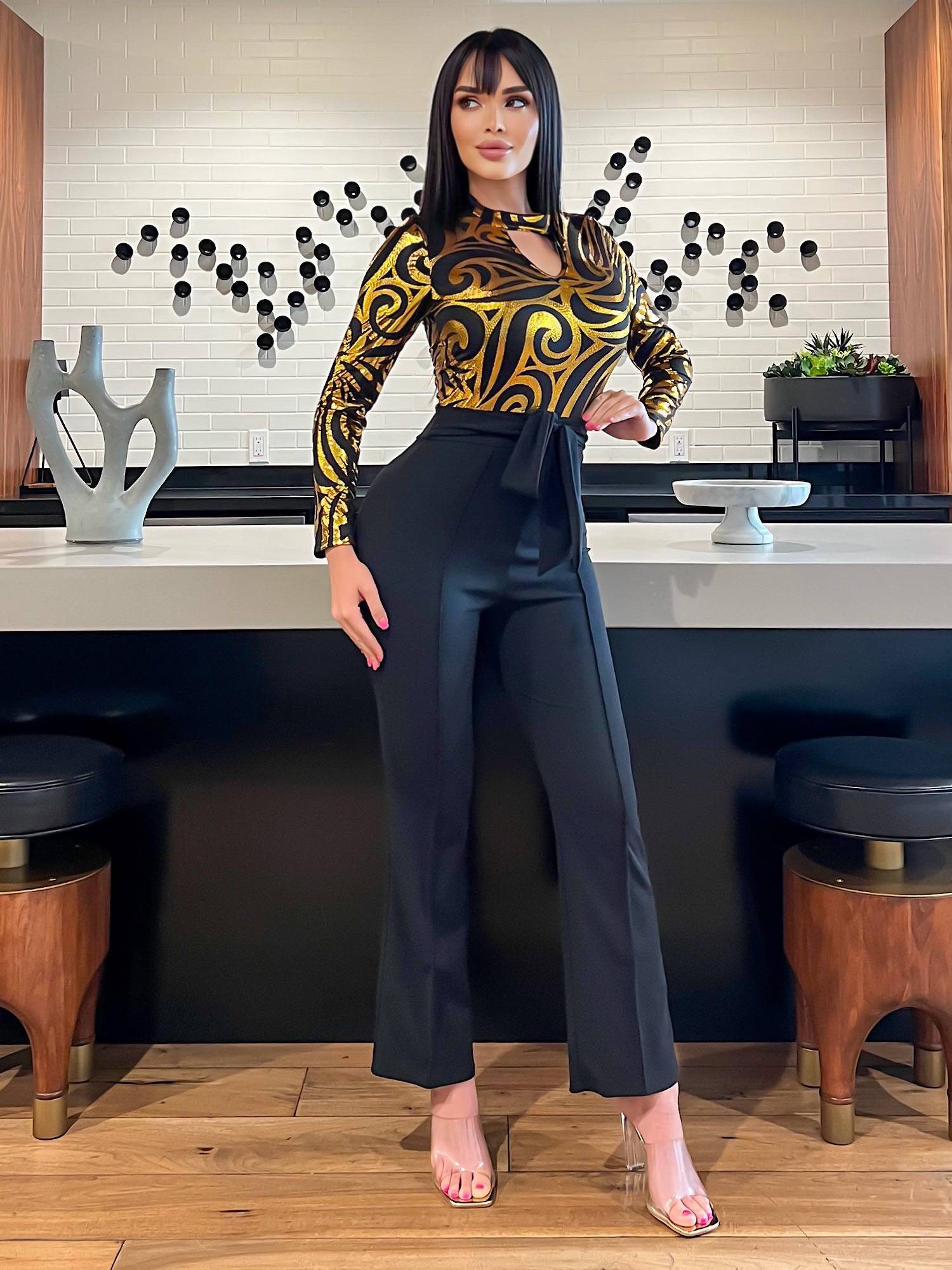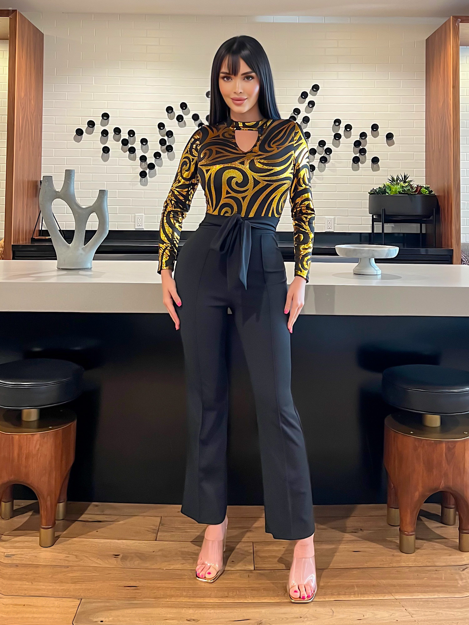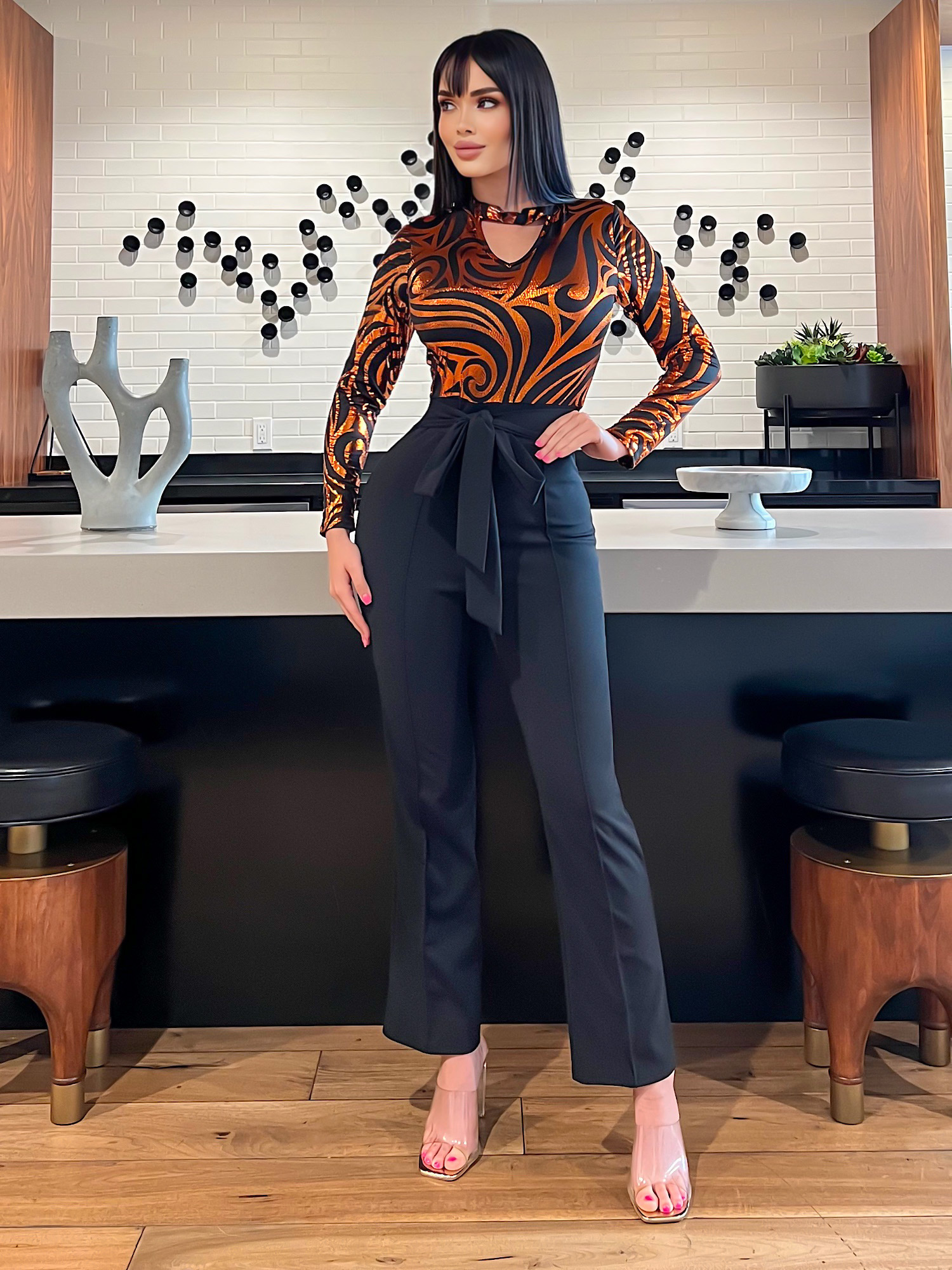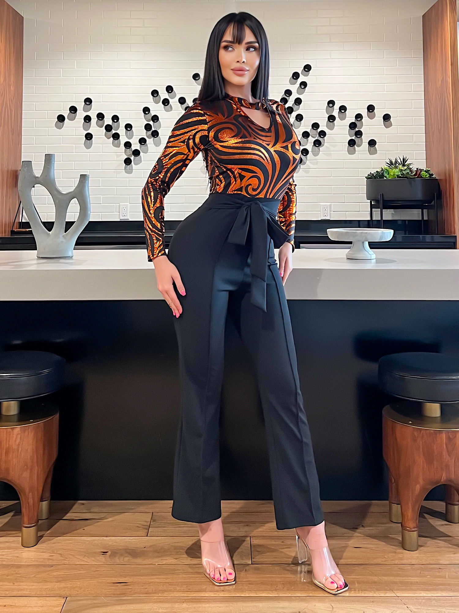 Long Sleeve Vibrant Metallic Print Party Jumpsuit Featuring a Tie Waist Contrast Crepe Fabric